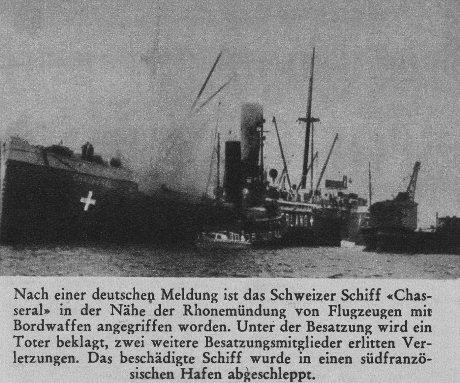 Schweizer Pressebericht vom 26. April 1944 über den britischen Luftangriff vor Sété auf die CHASSERAL. Das Foto jedoch zeigt den Dampfer in Lissabon als in der Copraladung ein Brand entstand am 21.08.1943 / Swiss press report from 26 April 1944 on the British air raid on the CHASSERAL off Sété. However, the photo shows the steamer in Lisbon when a fire broke out in the copra cargo on 21 August 1943