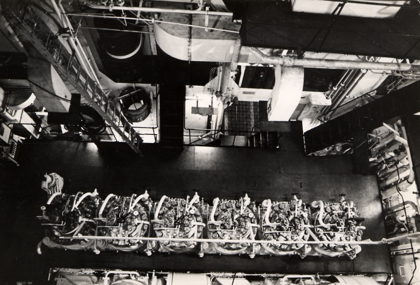 Engineroom view cylinder top of the 6RD68 Mitsubishi-Sulzer engine