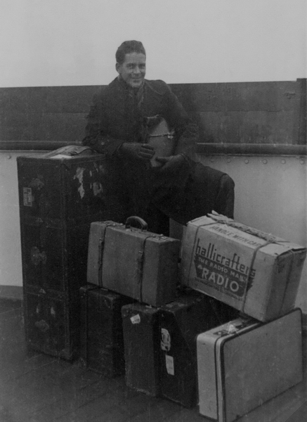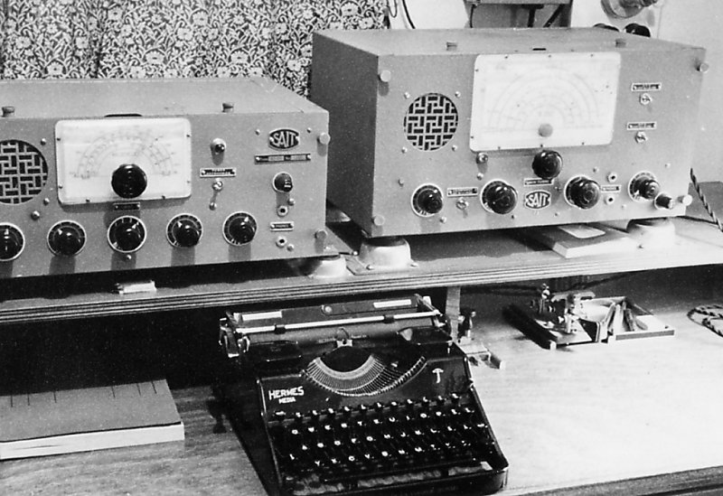 Funker Peter Haldemann mit viel Gepäck und Hallicrafters Funkgerät