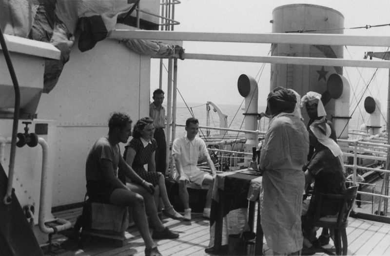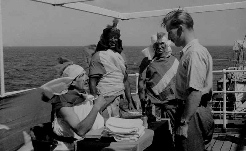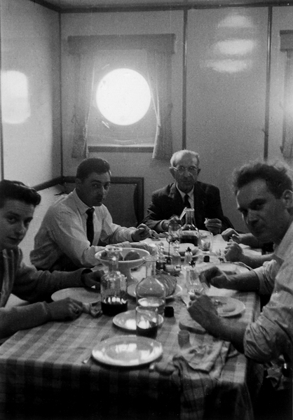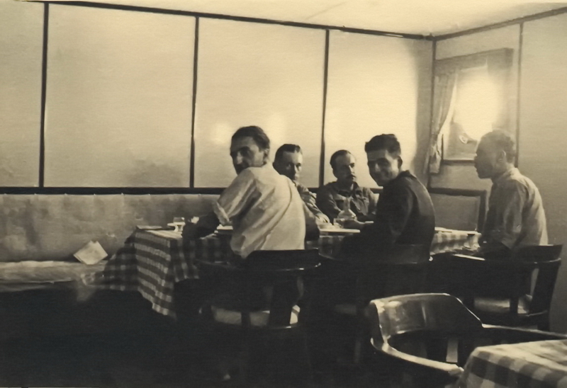 Offiziersmesse von links- nach rechts 4. Maschinist Maglia; 3. Decksoffizier Pichard; 2nd Mate Malatesta; 3rd Eng. Arena; 2nd Engineer Pirelli