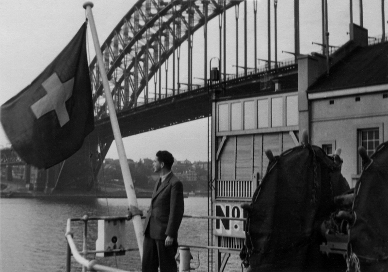 27.08.1950 Funker Haldemann mit Schweizer Flagge an der Pier bei der Sydney Harbour Bridge