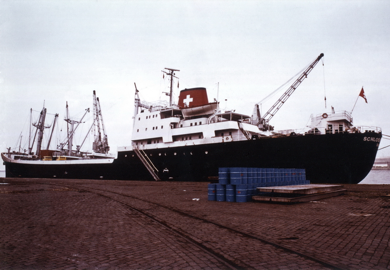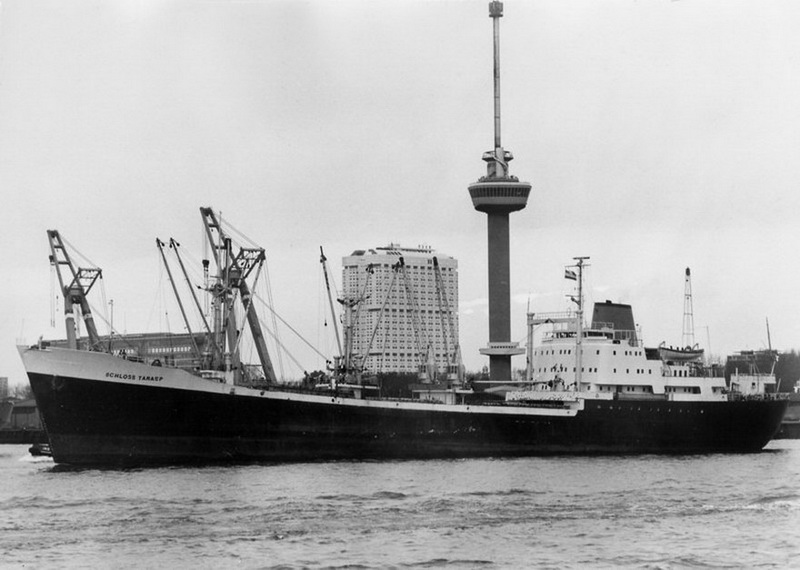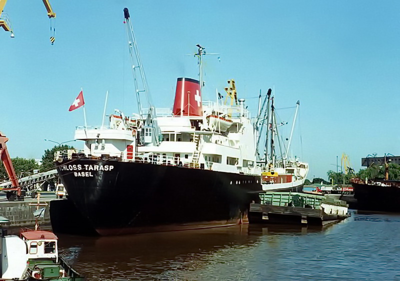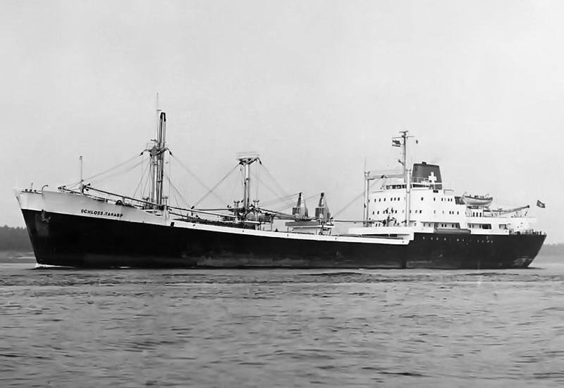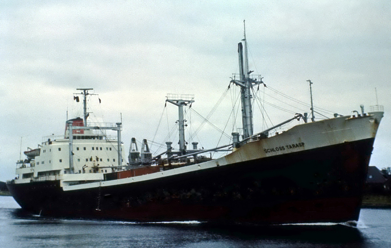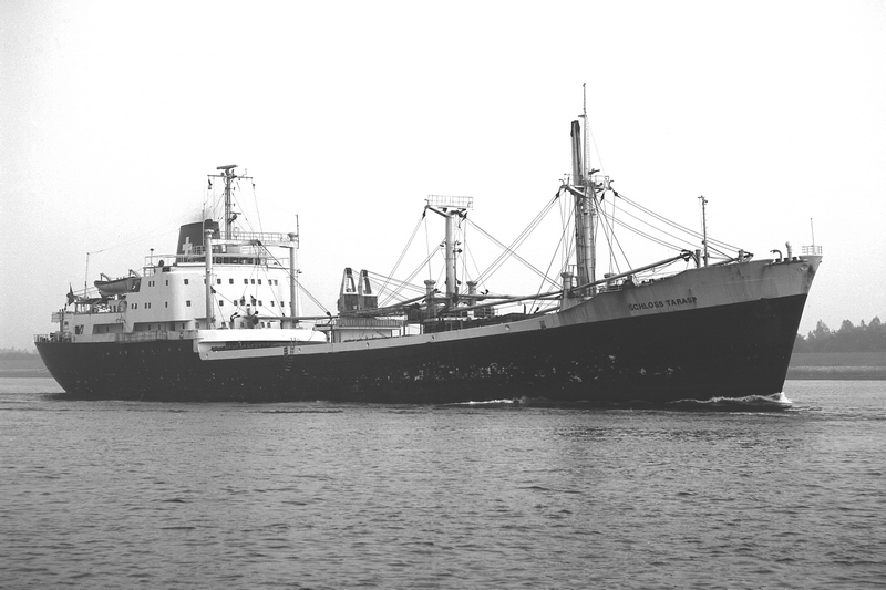 Launched on May 15, 1961, as THEBELAND at Wärtsilä Group Crichton-Vulcan AB (Åbo Varv) in Turku / Åbo (Construction No.: 1088). On December 17, 1961, delivered to the owners A/B Svenska Orient Linien (Management: William Thorén, Gothenburg), Gothenburg, with the dimensions: 121.32 x 17.58 x 6.51 m. GRT: 4832 / NRT: 2376 / DWT: 5725. Registration number: 10234. Call sign: SERD. The liner freighter was equipped with vegetable oil tanks and insulated compartments for refrigerated cargo (down to minus -27°). On June 19, 1963: Arrival at Crichton-Vulcan, Turku / Åbo, for an extension of approximately 13m, during which parts of the loading gear were also modernised. On 17.08.1963, it was put back into service. Lloyd's Register No.: 5358189. In June 1972, sold to Resolute Shipping Ltd., Montreal (Management: Burnett Chapman Ship Management Ltd., Newcastle upon Tyne) home port London (UK flag), not renamed. Official No.: 343216. Call sign: GQOP. In September 1976, sold to Cosmica Armadora S.A. (A. Yanakoudakis), Panama (Management: Regman Shipping Co. Ltd. (c/o Hadjilias & Co. Ltd, London), London & Piraeus / Arrow Line (London) Ltd., London) and renamed TATRINA. Registered in Piraeus. Official No.: 5834. Call sign: SXBJ. February 18, 1977: The ship caught fire in the English Channel. It was able to be brought to the anchorage at Le Havre. The fire was subsequently extinguished in the cargo hold. February 20, 1977: Departure to Antwerp, where the cargo was unloaded and repaired. On April 10, 1980, purchased by the newly founded Balaena A.G. shipping company in Cham, Canton of Zug, and renamed SCHLOSS TARASP (Management: Regman Shipping Co. Ltd. (c/o Hadjilias & Co. Ltd, London), London & Piraeus & Balaena AG, Cham). Register No.: 112. Call sign: HBFM. Laid up on January 4, 1982, in Ghent. The reason was the increasing tensions between England and Argentina over the Falkland (Malvinas) Islands, which led to a reduced cargo volume between the two countries, particularly affecting the Arrow Line. Most of the cargo was carried by this outsider shipping line between the two countries. Initially, a small core crew was still on board, which also managed the company ship TALAVERA, which was also laid up in Ghent. Previously, it was planned to bring this ship under the Swiss flag as well. Sold on December 6, 1983, to Hermes World Shipping Corp. S.A., Panama, and renamed TANJA, but still laid up in Ghent. Official No.: 12156LI. Call sign: 3FHK2. On June 4, 1984, left Gent in tow of the Dutch tug "Groenland," bound for Avilés, Spain, and arrived in San Esteban de Pravia on June 8, 1984, for scrapping and was dismantled at Desguaces Avilés S.A. Sources: