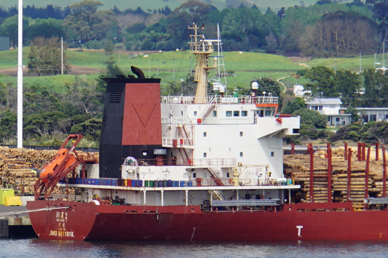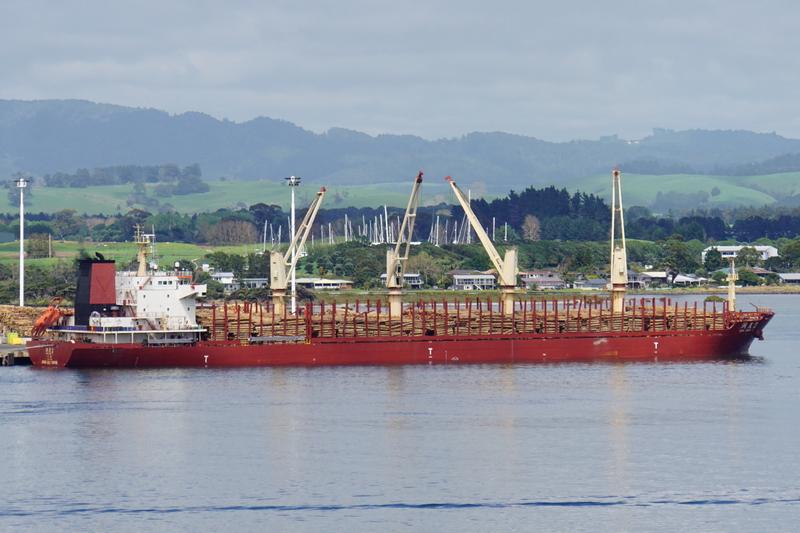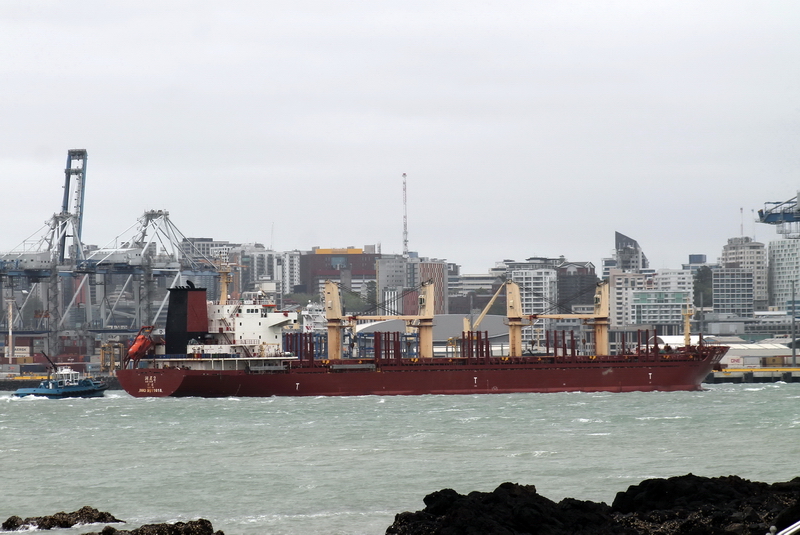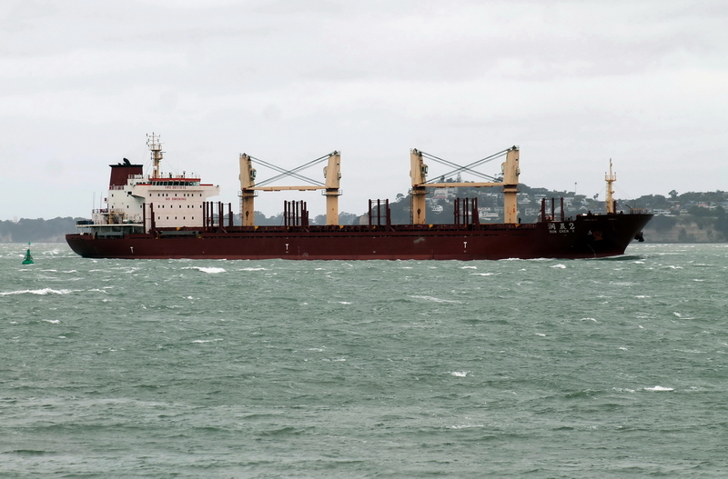 Chinese flag bulker carrier RUN CHEN 2 runs into harbour on a stormy day in Auckland, New Zealand on October 23, 2021