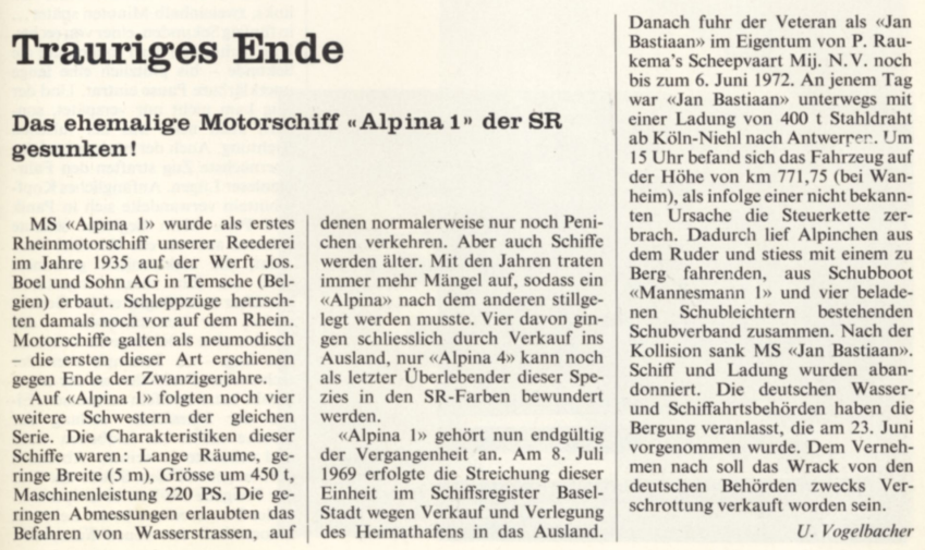 Die ALPINA-1 wurde 1935 gebaut als 1. Gütermotorschiff für die Schweizerische Schleppschiffahrtsgenossenschaft, nach den Plänen vom Schweizer Schiffbau-Ingenieur, Adolf J. Ryniker, bei Jos. Boel & Fils, Tamise / Temsche (Bau Nr.: 877) für die Alpina Reederei A. G. in Basel (Management: Schweizerische Schleppschiffahrtsgenossenschaft Basel) und ist am 11.01.1936 in Fahrt gekommen mit der CH-Register Nr.: 234. Ab dem 24.06.1938, heisst das Management: Schweizerische Reederei AG (SRAG), Basel. 1951 Verkauft an die Schweizerische Reederei AG Basel. Nicht umbenannt. Am 8. Juli 1969 Verkauf an P. Raukema's Scheepvaart Maatschappij N. V. in Dordrecht und umbenannt in JAN BASTIAAN. Register Nr.: 4349 R Dordt. Am 6. Juni 1972 auf der Reise von Köln-Niehl nach Antwerpen mit 400 Tonnen Stahldraht, brach um 15:00h auf der Höhe von KM 771.75 bei Wanheim (Duisburg), die Ruderkette und das Schiff lief aus dem Ruder und wurde vom Schubverband "Mannesmann 1" der zu Berg fuhr, gerammt, worauf die JAN BASTIAAN rasch sank. Das Wrack wurde am 23.06.1972 geborgen und von den deutschen Behörden zur Verschrottung verkauft. Herr Urs Vogelbacher (Tatkräftiger Supporter mit Bildern & Unterlagen für www.swiss-ships.ch ) hat damals in der Personalzeischrift PANALPINA Nr. 3/4 vom Dezember 1972 der Schweizerischen Reederei AG Basel, den folgenden Bericht über das Schiff geschrieben: TRAURIGES ENDE GMS ALPINA-1 wurde als erstes Rheingütermotorschiff unserer Reederei im Jahre 1935 auf der Werft Jos. Boel & Sohn AG in Temsche (Belgien) erbaut. Schleppzüge herrschten damals noch vor auf dem Rhein. Motorschiffe galten als neumodisch - die ersten dieser Art erschienen gegen Ende der Zwanzigerjahre. Auf ALPINA-1 folgten noch vier weitere Schwestern der gleichen Serie. Die Charakteristiken dieser Schiffe waren: Lange Laderäume, geringe Breite (5 m), Grösse um 450 t, Maschinenleistung 220 Ps. Die geringen Abmessungen erlaubten das Befahren von Wasserstrassen, auf denen normalerweise nur noch Pénichen (Spitse) verkehrten. Aber auch Schiffe werden älter. Mit den Jahren traten immer mehr Mängel auf, sodass ein "Alpina" nach dem anderen Stillgelegt werden musste. Vier davon gingen schliesslich durch Verkauf ins Ausland, nur die ALPINA 4 kann noch als letzter Überlebender dieser Spezies in den SR-Farben bewundert werden. Die ALPINA-1 gehört nun aber endgültig der Vergangenheit an. Am 8. Juli 1969 erfolgte die Streichung dieser Einheit im Schiffsregister Basel-Stadt wegen Verkauf und Verlegung des Heimathafens in das Ausland. Danach fuhr der Veteran als JAN BASTIAAN im Eigentum von P. Raukema's Scheepvaart Maatschappij N. V. Dordrecht noch bis zum 6. Juni 1972. An jenem Tag war die JAN BASTIAAN unterwegs mit einer Ladung von 400 t Stahldraht ab Köln-Niehl nach Antwerpen. Um 15 Uhr befand sich das Schiff auf der Höhe von Rkm 771.75 (bei Wanheim), als infolge einer nicht bekannten Ursache die Steuerkette zerbrach. Dadurch lief "Alpinchen" aus dem Ruder und stiess mit einem zu Berg fahrenden, aus Schubboot MANNESMANN 1 und vier beladenen Schubleichtern bestehenden Schubverband zusammen. Nach der Kollision sank die JAN BASTIAAN rasch. Schiff und Ladung wurden abandoniert. Die deutschen Wasser-und Schiffahrtsbehörden haben die Bergung veranlasst, die am 23 Juni 1972 vorgenommen wurde. Dem Vernehmen nach soll das Wrack von den deutschen Behörden zwecks Verschrottung verkauft worden sein.