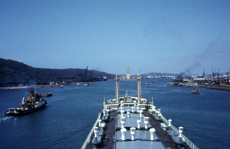Einlaufend Durban zum Bunkern mit Dampfschlepper J D WHITE an der Backbordseite 12. November 1967 / Entering Durban for bunkering with the steam tug J D WHITE on the port side November 12, 1967