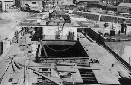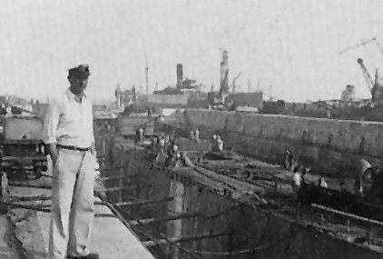 Funkoffizeir Harald Ihringer vor dem blanken Rumpf ohne Aufbauten im Dock in Lissabon / Funkoffizeir Harald Ihringer in front of the bare hull without superstructure in the dock in Lisbon
