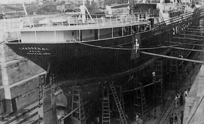 Ende 1941 wird die S/S CHASSERAL in Lissabon in der Werft Companhia Uniao Fabril überholt und umgebaut. 60% der Eisenteile des Schiffes wurden damals erneuert. Die Ölfeuerung wurde wieder durch konventionelle Kohlefeuerung ersetzt, da Kohle während des Krieges wesentlich einfacher zu beschaffen war als Marine Fuel oder Dieselöl / At the end of 1941, the S/S CHASSERAL was overhauled and converted at the Companhia Uniao Fabril shipyard in Lisbon. 60% of the ship's iron parts were replaced at that time. Oil firing was replaced by conventional coal firing, as coal was much easier to obtain during the war than marine fuel or diesel oil