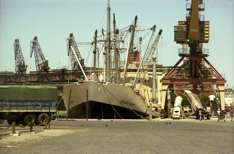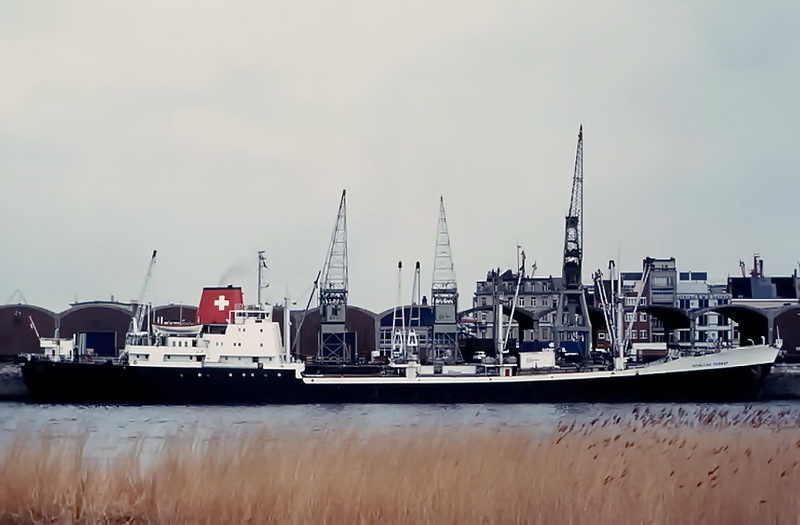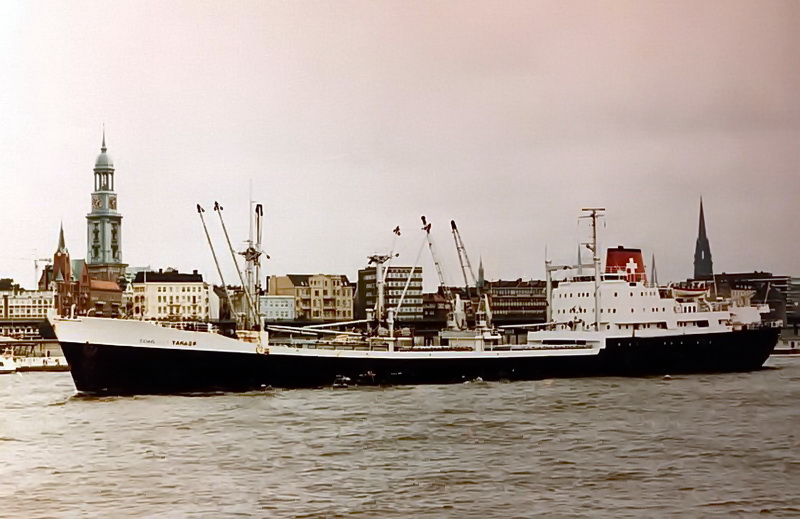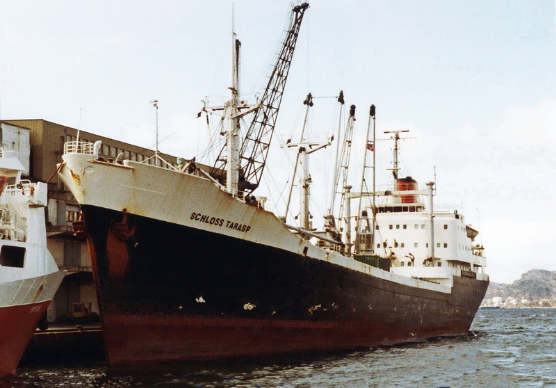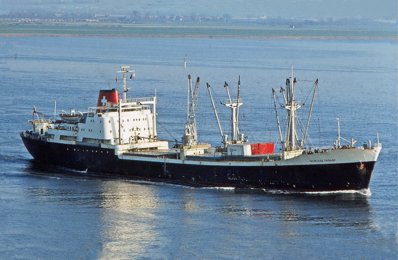 Launched on May 15, 1961, as THEBELAND at Wärtsilä Group Crichton-Vulcan AB (Åbo Varv) in Turku / Åbo (Construction No.: 1088). On December 17, 1961, delivered to the owners A/B Svenska Orient Linien (Management: William Thorén, Gothenburg), Gothenburg, with the dimensions: 121.32 x 17.58 x 6.51 m. GRT: 4832 / NRT: 2376 / DWT: 5725. Registration number: 10234. Call sign: SERD. The liner freighter was equipped with vegetable oil tanks and insulated compartments for refrigerated cargo (down to minus -27°). On June 19, 1963: Arrival at Crichton-Vulcan, Turku / Åbo, for an extension of approximately 13m, during which parts of the loading gear were also modernised. On 17.08.1963, it was put back into service. Lloyd's Register No.: 5358189. In June 1972, sold to Resolute Shipping Ltd., Montreal (Management: Burnett Chapman Ship Management Ltd., Newcastle upon Tyne) home port London (UK flag), not renamed. Official No.: 343216. Call sign: GQOP. In September 1976, sold to Cosmica Armadora S.A. (A. Yanakoudakis), Panama (Management: Regman Shipping Co. Ltd. (c/o Hadjilias & Co. Ltd, London), London & Piraeus / Arrow Line (London) Ltd., London) and renamed TATRINA. Registered in Piraeus. Official No.: 5834. Call sign: SXBJ. February 18, 1977: The ship caught fire in the English Channel. It was able to be brought to the anchorage at Le Havre. The fire was subsequently extinguished in the cargo hold. February 20, 1977: Departure to Antwerp, where the cargo was unloaded and repaired. On April 10, 1980, purchased by the newly founded Balaena A.G. shipping company in Cham, Canton of Zug, and renamed SCHLOSS TARASP (Management: Regman Shipping Co. Ltd. (c/o Hadjilias & Co. Ltd, London), London & Piraeus & Balaena AG, Cham). Register No.: 112. Call sign: HBFM. Laid up on January 4, 1982, in Ghent. The reason was the increasing tensions between England and Argentina over the Falkland (Malvinas) Islands, which led to a reduced cargo volume between the two countries, particularly affecting the Arrow Line. Most of the cargo was carried by this outsider shipping line between the two countries. Initially, a small core crew was still on board, which also managed the company ship TALAVERA, which was also laid up in Ghent. Previously, it was planned to bring this ship under the Swiss flag as well. Sold on December 6, 1983, to Hermes World Shipping Corp. S.A., Panama, and renamed TANJA, but still laid up in Ghent. Official No.: 12156LI. Call sign: 3FHK2. On June 4, 1984, left Gent in tow of the Dutch tug "Groenland," bound for Avilés, Spain, and arrived in San Esteban de Pravia on June 8, 1984, for scrapping and was dismantled at Desguaces Avilés S.A. Sources: