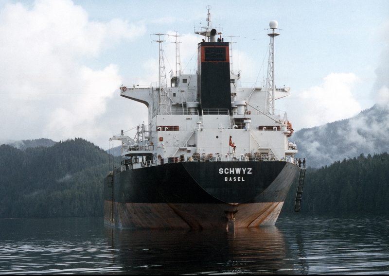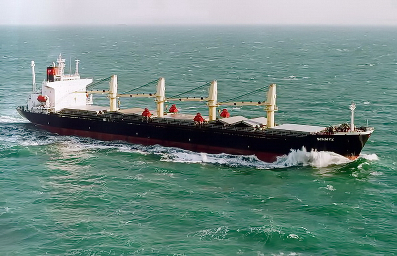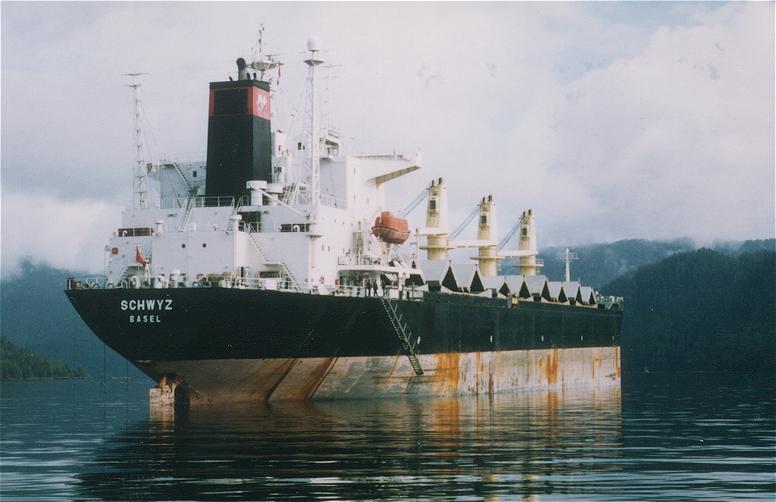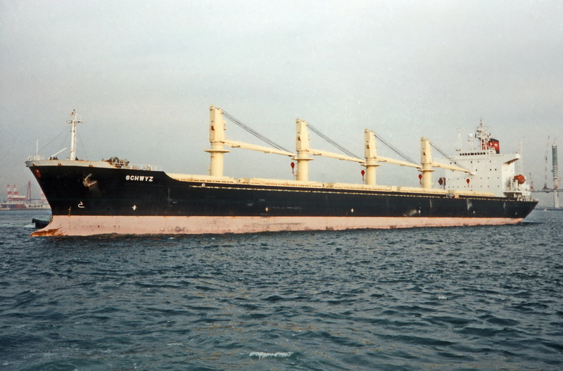 Il m/s SCHWYZ, un cargo della classe Handy-Size, è stato impostato in cantiere il 25 gennaio 1989 dalla Tsuneishi Zosen Shipbuilding Company Ltd. a Numkuma (Giappone). Esso è stato varato il 20 marzo 1989 con il nome di m/s ORIENT RIVER, consegnato il 16 giugno 1989 alla società Lepta Shipping Co. Ltd. di Panama e registrato sotto bandiera panamense. Fino al 1991 la sua gestione era di competenza della compagnia armatoriale Orient Marine Co. Ltd. (Toyo Senpaku K. K.), Tokyo). Segnale di chiamata di allora: 3EJK7. Nel 1991, la nave è stata venduta alla Callisto Maritime SA di Panama, pur conservando la bandiera panamense. Allora il cargo era gestito dalla MMS Co. Ltd. di Tokyo. Il 15 febbraio 1995 la Masscapital SA di Friburgo l’ha acquistata registrandola, con il nome di m/s SCHWYZ, sotto la bandiera svizzera. L’armatore Massoel Gestion Maritime SA di Ginevra ha assunto la sua gestione. Il trasferimento della nave al nuovo proprietario è avvenuto a Inchon (Corea del Sud). Il m/s SCHWYZ è una nave gemella del m/s AVENTICUM. La nave è dotata di un motore Mitsui B&W 6L60MCE Generator a 6 cilindri con una potenza di 9’680 CV o 7'118 kWh. In seguito il proprietario attuale ha munito il m/s SCHWYZ di un terzo motore ausiliario. Il bastimento dispone di quattro gru di carico elettroidrauliche di 30 t. Segnale di chiamata: HBLG. Il 18-12-1996 il management passa alla Massoel Gestion Maritime S.A., Genève. Dal luglio del 2002 il management prende il nome Massoel Gestion S.A., Genève. Venduta a giugno del 2003. 17-10-2003, consegnata a Dubai, UAE, alla Oceanic Transport Ltd. (management: Ocean Bulk Carriers Ltd., Londra), Londra e nominata ENGLISH EMINENCE. Numero matricola: 908024. Nominativo internazionale: MCPV9. Nel luglio del 2004 ceduta alla Shanghai Time Shipping Co. Ltd. (management: China Shipping Guangzhou Ship Management Co. Ltd., Guangzhou, Guangdong Province), Shanghai e nominata YIN PENG. Nominativo internazionale: BPDR. Il 28-05-2014 arrivo a Jingjiang, Cina, per essere demolito presso la società di commercio di rottami Su Heng Ocean Engineering Co. Fonti: