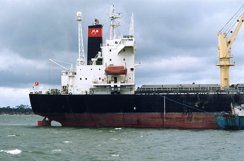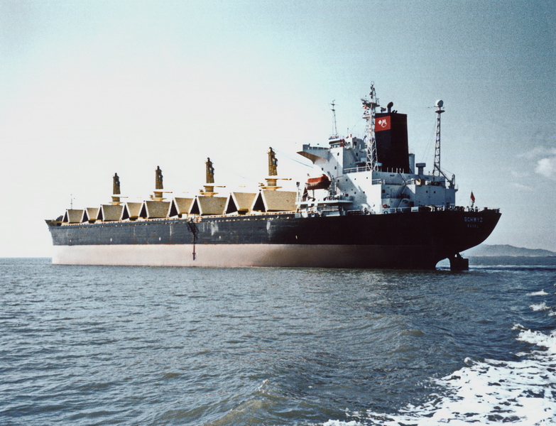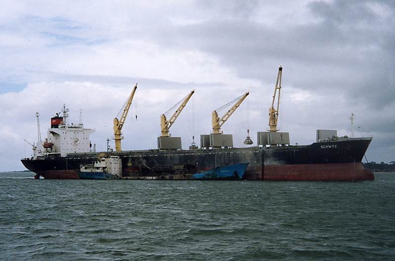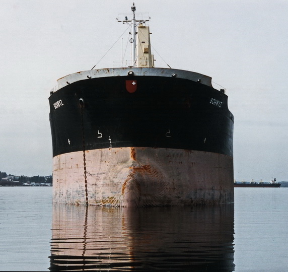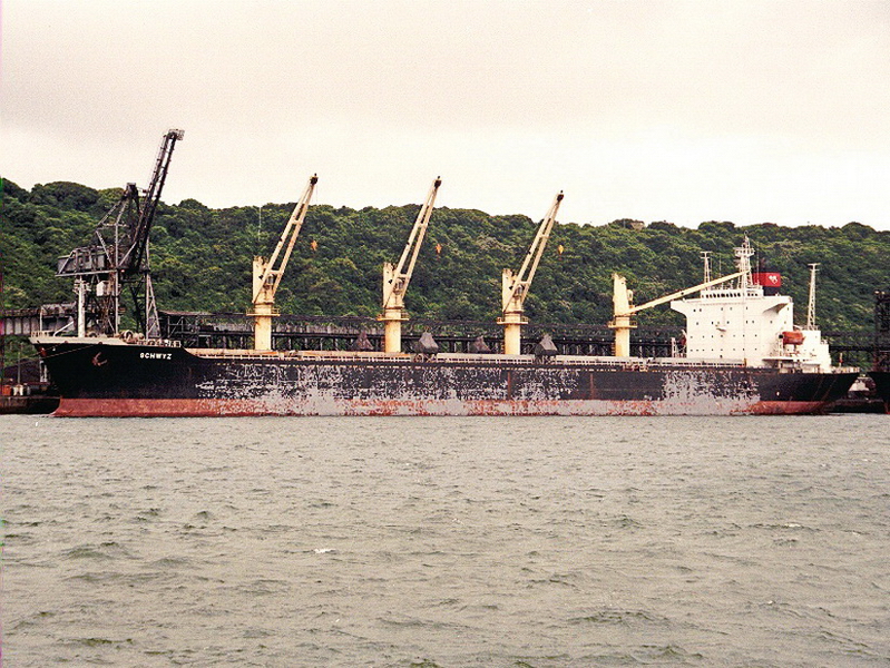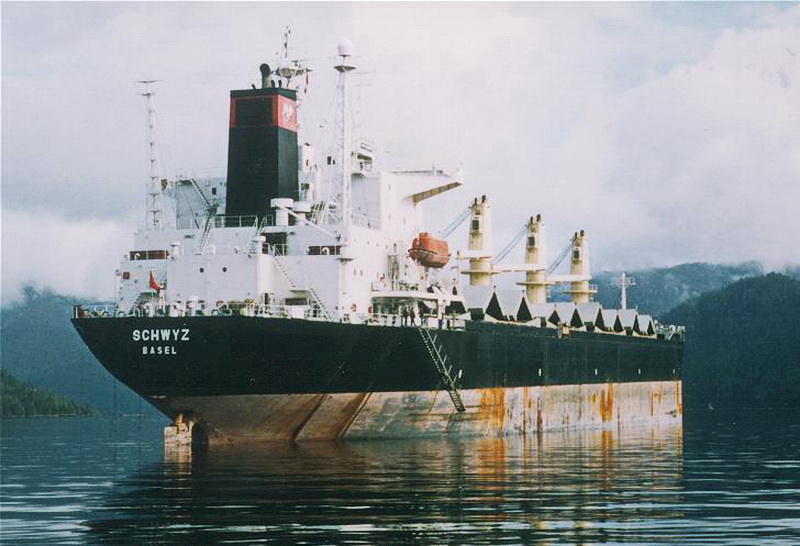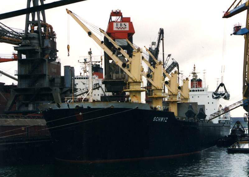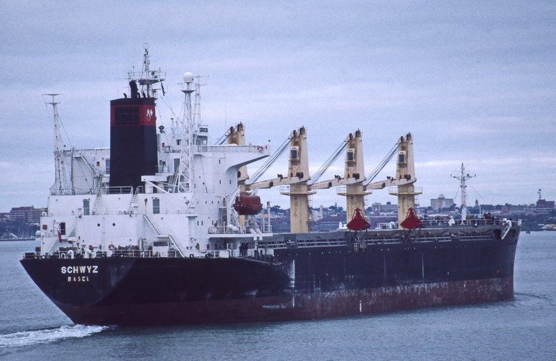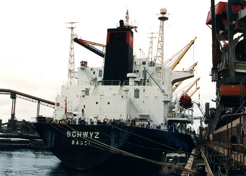 The m/v SCHWYZ, a bulk carrier of the handy-size class, was laid down at the Tsuneishi Zosen Shipbuilding Company Ltd. Yard in Numkuma, Japan on January 25th 1989. She was launched as the ORIENT RIVER on March 20th 1989, delivered to her owners, the Lepta Shipping Co. Ltd. Of Panama on June 16th 1989, and registered under the Panamanian flag. The Orient Marine Co. Ltd. (Toyo Senpaku K.K., Tokyo), Tokyo managed her until 1991. IMO No.: 8901781. Official No.: 19261-YJ. Her callsign at that time was 3EJK7. In 1991 the ship was sold to the Callisto Maritime SA, Panama, remaining registered in Panama. From then on she was managed by MMS Co. Ltd., Tokyo. Renamed AZTLAN. Official No.: 19261-PEXT1. Masscapital S.A. of Fribourg (Management: Acomarit Services Maritimes S.A., Genève) bought the ship on February 15th 1995 and registered her under the Swiss flag as the SCHWYZ. The transfer to the new owners took place in Inchon (South Korea). The SCHWYZ is a sister ship of the AVENTICUM. The SCHWYZ is driven by a Mitsui B&W 6L60MCE with 6 cylinders and an output of 9’680 hp, equivalent to 7’118 kW. A third auxiliary generator has been retrofitted by the present owners. The SCHWYZ has four 30-tonne electro-hydraulic deck cranes. Official No.: 143. Call sign: HBLG. 18.12.1996: The management changed to Massoel Gestion Maritime S.A., Genève. Since July 2002 the Management name was restyled into Massoel Gestion S.A., Genève. 2003: Sold in June 2003 for $ 9.2 million. 17.10.2003: Delivered to Oceanic Transport Ltd. (Management: Ocean Bulk Carriers Ltd., London), London and renamed ENGLISH EMINENCE at Dubai, UAE. Official No.: 908024. Call sign: MCPV9. On 28.05.2014, arrival in Jingjiang, China to be scrapped at the scrap trading company Su Heng Ocean Engineering Co. Sources: